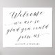 Simple Elegant Calligraphy Script Wedding Welcome Sign We are so glad you could join us in beautiful flowing fancy letters and your personalized names. A stylish yet simple formal design in black and white or any background color you choose. Just click the customize further link, shown under the text personalization area on the right, and choose your custom color background. This sign poster template makes it fast and easy to create stunning additions to your wedding decor. Signs can be enlarged, there are many sizes to choose from, as well as options for custom framing and matting. Welcome wedding custom signage.