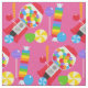 If you love the candy you'll love this fun, colorful So Much Candy fabric featuring a pink background with a gumball machine full of gumballs, starlight swirl candies, lollipops, and wrapped roll candies in bright colors!