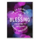Wish someone a happy birthday with this unique typography badge style card, featuring the message, "I'm so thankful for you and the blessing you bring to everyone. Happy Birthday!" White type appears on abstract bokeh purple lights background. Inside left includes this scripture, "A sweet friendship refreshes the soul. Proverbs 27:9" Inside right includes this fully-editable message: "You are a gift from God that I treasure deeply, and I pray that the year ahead will be filled with beauty, light, peace, and joy. HAPPY BIRTHDAY!"