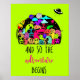 Poster with rhe saying - and so the adventure begins with a drawing of cute monsters. These creatures come in a variety of colors all standing around hanging out together having fun. Set on an outer space cosmic style theme with spaceships and planets and stars.