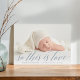 A sweet and elegant birth announcement design featuring a full bleed horizontal or landscape oriented photo with "so this is love" overlaid in chic calligraphy script lettering. Your baby's name and birth stats appear beneath in classic gray. Add three additional square photos to the back, along with a personal message.