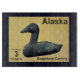 A postage stamp from a mythical independent Alaska featuring a soapstone carving of an Eider Duck. The background is brain tanned moose hide. This is a digital rendering, not an actual soapstone object. The Common Eider, Somateria mollissima, is the largest duck found in Europe and in North America (except for the Muscovy Duck which only reaches North America in a wild state in southernmost Texas) The Eider is distributed over the northern coasts of Europe, North America and eastern Siberia. It breeds in Arctic and some northern temperate regions, but winters somewhat farther south in temperate zones, when it can form large flocks on coastal waters. It can fly at speeds up to 70 mph (113 km). The Eider is characterized by its bulky shape and large, wedge-shaped bill. The male is unmistakable, with its black and white plumage and green nape. The female is a brown bird, but can still be readily distinguished from all ducks, except other eider species, on the basis of size and head shape. This duck's call is a pleasant "ah-ooo." The species is often readily approachable. Drakes of the European, eastern North American and Asia/western North American races can be distinguished by minor differences in plumage and bill color. This species dives for crustaceans and molluscs, with mussels being a favored food. The Eider will eat mussels by swallowing them whole; the shells are then crushed in their stomachs and excreted. When eating a crab the Eider will remove all of its claws and legs and then eat the body in a similar fashion. It is abundant, with populations of about 1.5-2 million birds in both North America and Europe, and also large but unknown numbers in eastern Siberia. A particularly famous colony of eiders lives on the Farne Islands in Northumberland, England. These birds were the subject of one of the first ever bird protection laws, established by Saint Cuthbert in the year 676. About 1,000 pairs still nest there every year. Because St. Cuthbert is the patron saint of Northumberland, it was natural that the eider should be chosen as the county's emblem bird; the birds are still often called Cuddy's ducks in the area, "Cuddy" being the familiar form of "Cuthbert". The Common Eider is one of the species to which the Agreement on the Conservation of African-Eurasian Migratory Waterbirds (AEWA) applies. Eiders are colonial breeders. They nest on coastal islands in colonies ranging in size of less than 100 to upwards of 10,000-15,000 individuals. Female eiders frequently exhibit a high degree of natal philopatry, where they return to breed on the same island where they were hatched. This can lead to a high degree of relatedness between individuals nesting on the same island, as well as the development of kin-based female social structures. This relatedness has likely played a role in the evolution of co-operative breeding behaviours amongst eiders. Examples of these behaviours include laying eggs in the nests of related individuals and crèching, where female eiders team up and share the work of rearing ducklings. The eider's nest is built close to the sea and is lined with the celebrated eiderdown, plucked from the female's breast. This soft and warm lining has long been harvested for filling pillows and quilts, but in more recent years has been largely replaced by down from domestic farm-geese and synthetic alternatives. Although eiderdown pillows or quilts are now a rarity, eiderdown harvesting continues and is sustainable, as it can be done after the ducklings leave the nest with no harm to the birds.