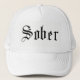 White hat with black print, Gothic style "Sober." Trucker hat.