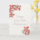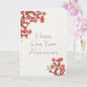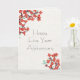 This 5" x 7" folded greeting card features whimsical red flowers on an ivory background with a placeholder to add any name. The customizable greeting is, "Happy Five Year Anniversary." The back, "Congratulations (any name) You've done the work and it shows!"
