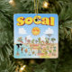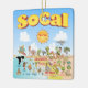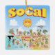 Bright and colorful scene offers a spectacular view of Southern California - wacky characters frolic on the beach and desert of SoCal showcasing Los Angeles, San Diego, Santa Barbara, Riverside, Palm Springs, Anaheim, Anza Borrego and Joshua Tree parks as well as the border cities of Tijuana, Tecate and Mexicali. This charming scene has it all – a surfer hangs ten while a mermaid lounges on a rock, a killer whale leaps out of the water, zoo animals greet the tourists, a muscular beach couple both flex to impress as a T-Rex roars a challenge and a tank moves into position and much more…