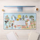 Bright and colorful scene offers a spectacular view of Southern California - wacky characters frolic on the beach and desert of SoCal showcasing Los Angeles, San Diego, Orange County, Santa Barbara, Palm Springs, Palm Desert, El Centro, Arrowhead Lake and Big Bear and Anza Borrego and Joshua Tree parks as well as the border cities of Tijuana, Tecate and Mexicali. This charming scene has it all – a surfer hangs ten while a killer whale leaps out of the water, zoo animals greet the tourists, a posh couple celebrate with a toast, an alien examines a hiker and much more!