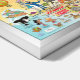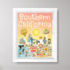 Bright and colorful scene offers a spectacular view of Southern California - wacky characters frolic on the beach and desert of SoCal showcasing Los Angeles, Orange County, San Diego, Santa Barbara, Riverside, Palm Springs, El Centro, Salton Sea, Anza Borrego and Joshua Tree parks as well as the border cities of Tijuana, Tecate and Mexicali. This charming scene has it all – a surfer hangs ten while a killer whale leaps out of the water, zoo animals greet the tourists, wine lovers make a toast as a hiker is scanned by a UFO and much more…
