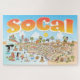 Bright and detailed whimsical vision of Southern California - featuring Los Angeles and San Diego and Orange County plus many major cities and most beach towns - zany characters play on the beach and desert, mountains and valleys. This charming scene has it all – a surfer hangs ten while a mermaid lounges on a rock, a killer whale leaps out of the water as a t-rex roars a challenge, a muscular beach couple both flex to impress, zoo animals wait for tourists and a bull smashes into a bull fighter…