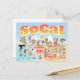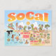 Bright and colorful scene offers a spectacular view of Southern California - wacky characters frolic on the beach and desert of SoCal showcasing Los Angeles, San Diego, Orange County, Santa Barbara, Riverside, Palm Springs, Anza Borrego and Joshua Tree parks as well as the border cities of Tijuana, Tecate and Mexicali. This charming scene has it all – a surfer hangs ten while a killer whale leaps out of the water, zoo animals greet the tourists, a muscular beach couple both flex to impress as a T-Rex roars a challenge and a tank moves into position and much more…