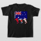 Three soccer players play in front of the Australian flag. Country name Australia is on the side