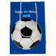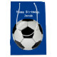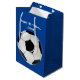Sports themed medium size gift bag done in royal blue with a big black and white soccer ball, on the front and back. White custom text is ready to personalize to read what you want. Matching tissue paper is available.