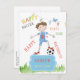Soccer / football little boy birthday real or virtual party invitation postcard featuring a funny kid character dressed in sports outfit with the age number on the t-shirt. +++++++++++++ Easy to personalize with your details on both sides!