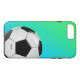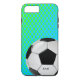 Custom soccer fan iPhone 7 Plus case, with graphics of a blue and green dot pattern background. Graphics of a soccer ball decorates the bottom right corner of the case and custom black text, on the bottom, is ready to personalize. Great phone case for the sports fan or soccer player.
