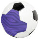 "Soccer ball featuring a geometric pattern with purple shapes against a white background. The pattern is showcased flat beneath the ball."