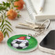 Festive Soccer Ball in a Santa Hat on Green ornaments, gifts, and fun holiday decorations feature our original art of a black and white soccer ball all decked out for the holidays wearing a red Santa hat against a green background with our dry brush texture. This fun holiday decorated sports ball is perfect for anyone who loves sports and decorating for the holidays. It's all fun and games at ITD Sports Center.