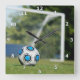 The blue and white soccer ball on grass is waiting to be kicked to score. The high resolution photograph creates an interesting soccer statement for the soccer lover. Personalize by adding the players name. Font can be changed by size, style, color or location.
