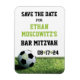 This soccer-themed Bar Mitzvah save the date magnet coordinates with the Soccer Stadium at Night Bar Mitzvah invitation and has a black, green, and white color scheme. It has a bottom border of a green grass soccer field with a black and white soccer ball on the lower left-hand corner. The save-the-date wording is in black and green lettering in sports-type fonts. There is a green Star of David on the soccer ball that you can remove if you want to use this save the date magnet for a different soccer or World Cup event.