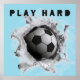 Creative soccer poster decor featuring a flying ball and the words: Play Hard.