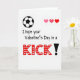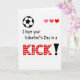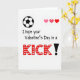 This Valentine's Day card features a white background with a black-and-white soccer ball in the upper left corner. In the upper right, three hearts sit together, shifting from light pink to deeper red to show growing affection. Across the center, the message reads, “I hope your Valentine’s Day is a KICK!” The words “I hope your Valentine’s Day is a” are in simple black lettering, easy to read and friendly. “KICK!” stands out in large red block letters with thin stripes inside the letters, and a black exclamation mark finishes the line. The mix of sporty and sweet details makes it feel like a fun way to say you care ❤️💌🍫.