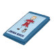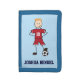 Personalize this wallet with your child's name and jersey number. Let me know if you want a different hair or outfit color, I can customize the soccer player with your choice of color. The background is a light blue color to change the color click on Edit, then Background. A color palette will pop up on your screen and you can change the color. Click on Done to save your changes. You can also change the font color, size and style (the current font used is Superstar). Please message me with any questions.