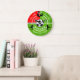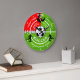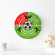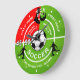 Soccer Match Soccer Clock. This novelty soccer clock is great fun for anyone who loves soccer! The design is based on a soccer match with a soccer field, with the center circle and in the middle, a soccer ball ready for kickoff. The match time starts at kickoff and has the first half of the game up until 45 minutes. Then there is the half-time shown in red. The second half starts again at kickoff and ends at 90 minutes when there is the final whistle. The soccer slogan reads: The Beautiful Game. Two soccer players ready to shoot at goal are also shown in silhouette. This fun soccer clock will look great in any room and makes a fun soccer gift for soccer players and soccer fans alike.