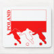 Three soccer players play in front of the Polish flag. Country name Poland is on the side