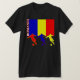 Three soccer players play in front of the Romanian flag. Country name Romania is on the side