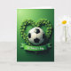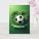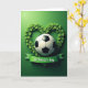 This design shows a black-and-white soccer ball centered inside a heart-shaped wreath made of many small green shamrocks, like a close hug that hints at friendship and a shared team spirit 💚. The background fades through layers of green, from light lime near the middle to deeper forest tones toward the edges, with soft shading that makes the main elements look slightly raised. Each clover leaf has gentle highlights and darker edges, giving the heart wreath texture and depth ☘️. Below the ball and shamrock heart, a curved green ribbon stretches across the lower portion of the card. The words “St. Patrick’s day” sit on the ribbon in white lettering, centered and easy to spot against the darker green. The smooth panels of the soccer ball contrast with the leafy shapes around it, drawing your eye back and forth between sport and celebration. The shamrock heart looks fuller at the top and sides, with tiny leaf tips overlapping to form a neat outline, and the ribbon ends curl outward beneath it for a layered look, made for sharing St. Patrick's Day sentiments.