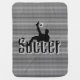 Pictured on top of the word Soccer a soccer player kicks the soccer ball