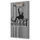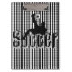 Pictured on top of the word Soccer a soccer player kicks the soccer ball
