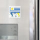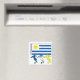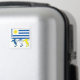 Three soccer players play in front of the Uruguayan flag. Country name Uruguay is on the side