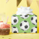 Wrapping paper shown with a sports soccer ball print on a green colored background. Customize this item or buy as is.