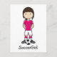 Cute girl wearing pink soccer clothes, between her soccer shoes is a soccer ball.