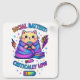 Vibrant, colorful design featuring a cozy cat wrapped in a blanket, sitting next to a stack of books sipping coffee. The colorful text reads: "Social battery critically low". This design is available on a wide variety of products.
