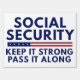 Display your commitment to protecting Social Security with our "Social Security Keep It Strong Pass It Along" yard sign, a powerful symbol advocating for the preservation of this essential program. Social Security provides critical support to nearly 61 million Americans, including retirees, veterans, disabled workers, widows, and children.By placing this sign in your yard, you join a collective voice demanding that policymakers honor their promises to safeguard Social Security from potential cuts or defunding. Your support helps ensure that future generations can rely on the stability and benefits that Social Security offers.Stand up for the well-being of our communities by proudly displaying this sign and making your stance on Social Security clear.