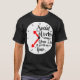 My 11 yo wore adult XL (5’7” 165#). The 8yo is small framed. She wore adult small and tied it in the back. Grandma wore adult large with long sleeve shirt underneath. Tall girl adult medium. Dark haired male adult large. Good quality dark Heather gray, Gildan brand shirt. -it was next up from basic choice and cost about $20 per shirt. Not too thick or thin. Washed and dried well, no major shrinkage. Not see-through. Can wear a bra under it fine. Screen print is just as shown and well done, front and back.