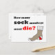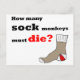Calling all sock monkey activists. It's time to shed the socks and spread the word about the wholesale slaughter of sock monkeys. This clever postcard design features a hand drawn picture of a brown and red sock and the caption, "How many sock monkeys must die?" This is the perfect postcard to raise sock monkey awareness.