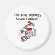 A sock monkey holds onto a soccer ball and kid style text reads "This little monkey loves soccer!" on soccer design T-shirts, cards, mugs, mousepads, and other soccer gear!