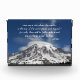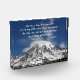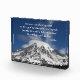 Acrylic photo block for display that features the photo image of a cap cloud over snow capped Mount Rainier along with a philosophical quote by historian, Socrates.