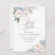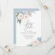 your names and all those special wedding details written in a classy gray font. Card reverse has as small bouquet on the bottom over a dusty blue background
