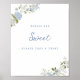 Blue floral “Babies Are Sweet” dessert table poster featuring a stunning watercolor floral design with soft delicate pastel dusty blue and white flowers, such as hydrangea. The playful handwritten font adds a charming vintage touch to the design and complements the florals perfectly.