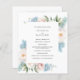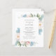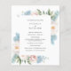 A frame of Rustic white blue and pink peony roses and Flowers with soft sage green leaves border your wedding details in a classic gray font. On the reverse side a template to insert the list the members of your wedding party (officiant, parents of bride and groom, maid of honor, best man, bridesmaids, groomsmen, flower girl and ring bearer)