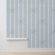 Soft blue and linen colored vertical striped wallpaper with dusty blue hand drawn bows.