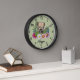 Destei's original cartoon illustration of a cute Soft-coated Wheaten Terrier breed dog's head close-up surrounded by colorful summer wildflowers. There is a blush pink flower, a purple flower, a dark pink flower and a white daisy flower together with some green leaves and branches. The background color is green with a light polka dot pattern. The background color can be changed to any other color and the polka dot pattern can be removed, if so wished. The hours are marked with numbers. The hours and minutes are shown with a dotted clock face. There is also a personalizable text area for a name or other custom text in a lovely script font.