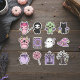 Bring a touch of gentle magic to your everyday items with this sheet of light-colored, eerie designs. This collection includes a friendly grim reaper, a little green zombie with wings, and a one-eyed pink monster. You will also discover mystical objects like a purple spell book with a star, a bubbling potion pot, and a striped wizard hat. Rounding out the set are fun details like a spiderweb sucker, a classic iron graveyard gate, and a twisting bare tree. These fun, cartoon-style illustrations combine mystical elements with light shades of purple and green for a wonderfully unique look.