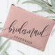 Celebrate your bridal party with this elegant soft coral pink bridesmaid accessory pouch. Featuring modern calligraphy and customizable with your bridesmaid's name, this pouch is both stylish and practical. The soft dusty sage color and elegant script create a sophisticated look, perfect for holding makeup, toiletries, or other essentials. This personalized pouch makes a thoughtful gift for your bridesmaids, adding a touch of luxury to their wedding day preparations.