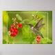 A sweet hummingbird hovers before bright red salvia blossoms against a soft green background.