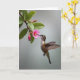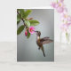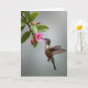 This card features a close-up nature scene where a tiny hovering bird leans toward a pink flower with a tender, almost affectionate focus ❤️. The bird sits to the right side, angled toward the left, with its long beak reaching into the flower’s center as if sharing a quiet moment. Soft grey-green tones blur into the background, keeping attention on the bird’s brown, white, and green sheen and the flower’s gentle petals. The wings appear as a light motion blur, adding energy while the bird’s body stays crisp and intent, like it can’t look away. On the upper portion, a short Mother’s Day greeting is set in a simple, easy-to-read style in white, with a smaller line beneath it in pale pink. The main bloom anchors the left side, and the warm golden center feels like a small sun between them 🌼. A second detail appears nearby: a deep red bud sits close to the open flower, still tightly curled.