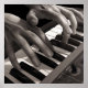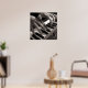 This extremely detailed hyperrealist oil painting by Jeff Bartels depicts a man playing a keyboard. The closely cropped, black and white image features both of the keyboardist's hands playing the synthesizer which is on a forty five degree angle. Strong light and shadows along with the tight cropping gives this painting a striking and dramatic feel.