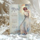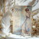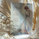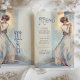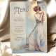 Enhance your wedding decor with this stunning Art Nouveau-inspired menu card, featuring a graceful woman in a flowing pastel gown highlighted by shimmering gold accents. The ethereal backdrop of soft blues, whites, and golden hues creates a dreamy and romantic atmosphere. Perfectly suited for vintage, classic, or celestial-themed weddings, this menu exudes elegance and sophistication. The refined typography complements the artistic design, making it an unforgettable addition to your wedding celebration. Fully customizable to display your unique menu details.